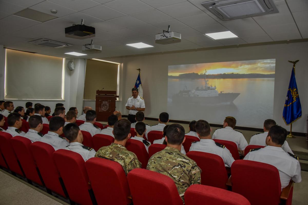 La actividad se desarrolló en el salón Hyatt de la Academia, instancia en la que el Contraalmirante compartió su experiencia profesional y transmitió un mensaje centrado en el compromiso, la excelencia y la responsabilidad que implica el proceso formativo en el ámbito naval.