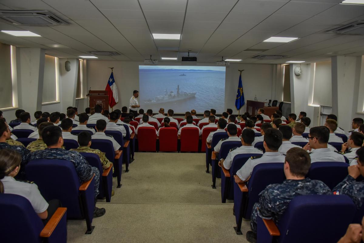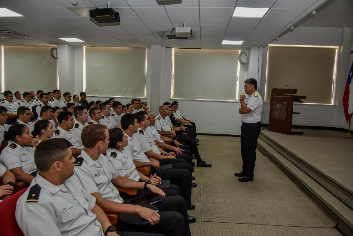 Durante su exposición, el Director de Educación destacó la prioridad de dedicar tiempo y esfuerzo al estudio, subrayando que el perfeccionamiento continuo constituye una herramienta esencial para el adecuado desempeño profesional. Enfatizó que, en la carrera naval, la sólida preparación técnica y el liderazgo son pilares fundamentales para servir con eficacia a la Institución y al país.