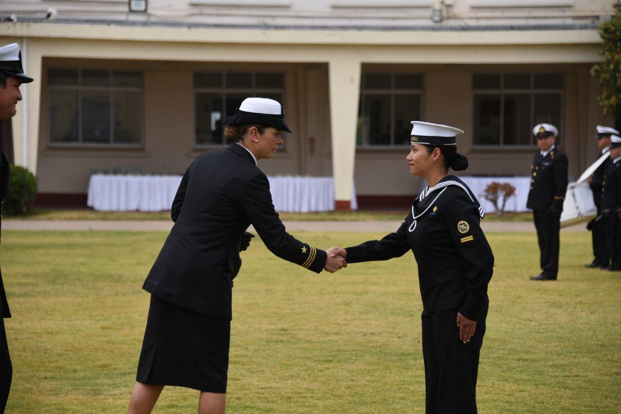 Luego, se realizó la entrega de estímulo al “mejor compañero” que recibió el Marinero 1° Litoral Comunicante Jean Vergara, por sus cualidades personales. Además, se entregaron premios a los primeros lugares en reconocimiento a la nota más alta de la graduación recayendo en:
