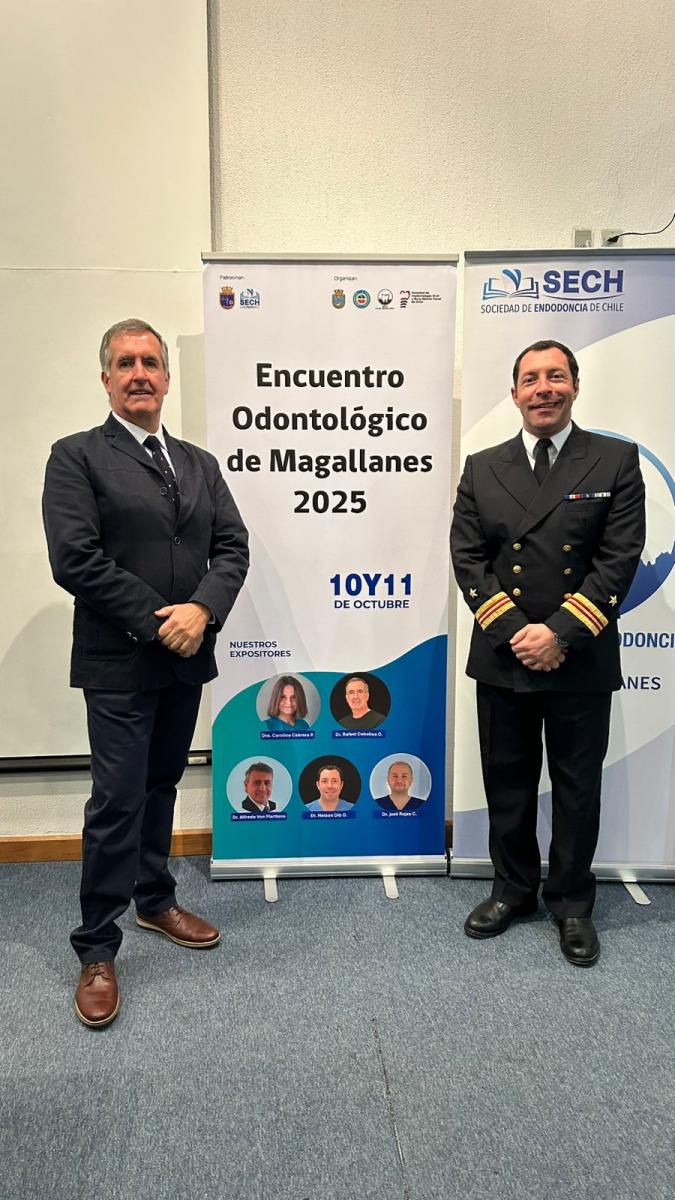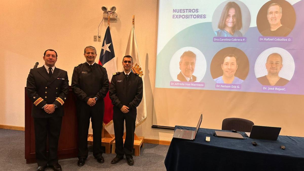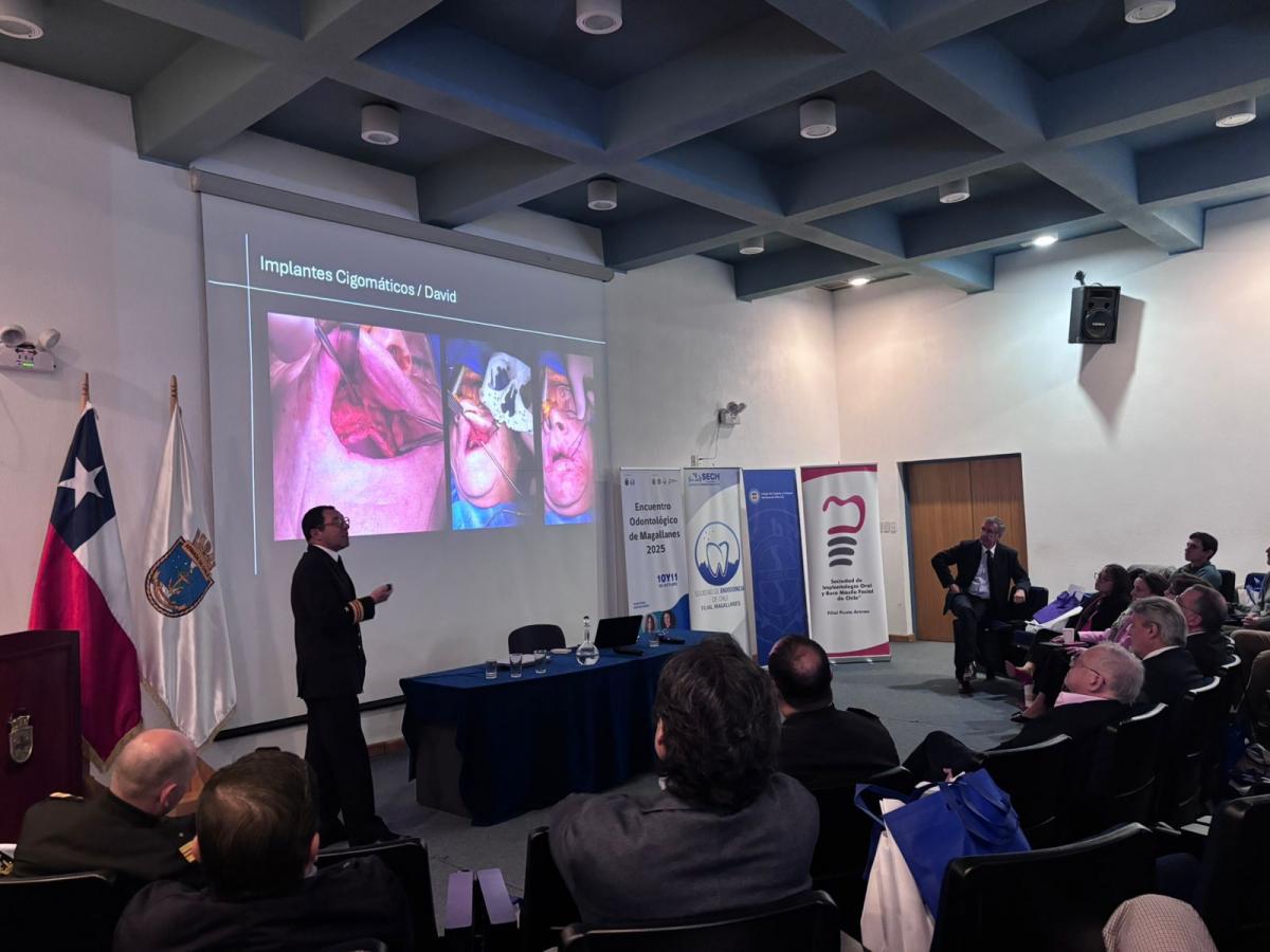 Durante la jornada, el Oficial, junto al CN SD Rafael Ceballos Olguín, compartió actualizaciones científicas y clínicas sobre las últimas técnicas quirúrgicas y rehabilitadoras en implantología, promoviendo el intercambio de conocimientos entre los profesionales del área odontológica de la Armada de Chile.