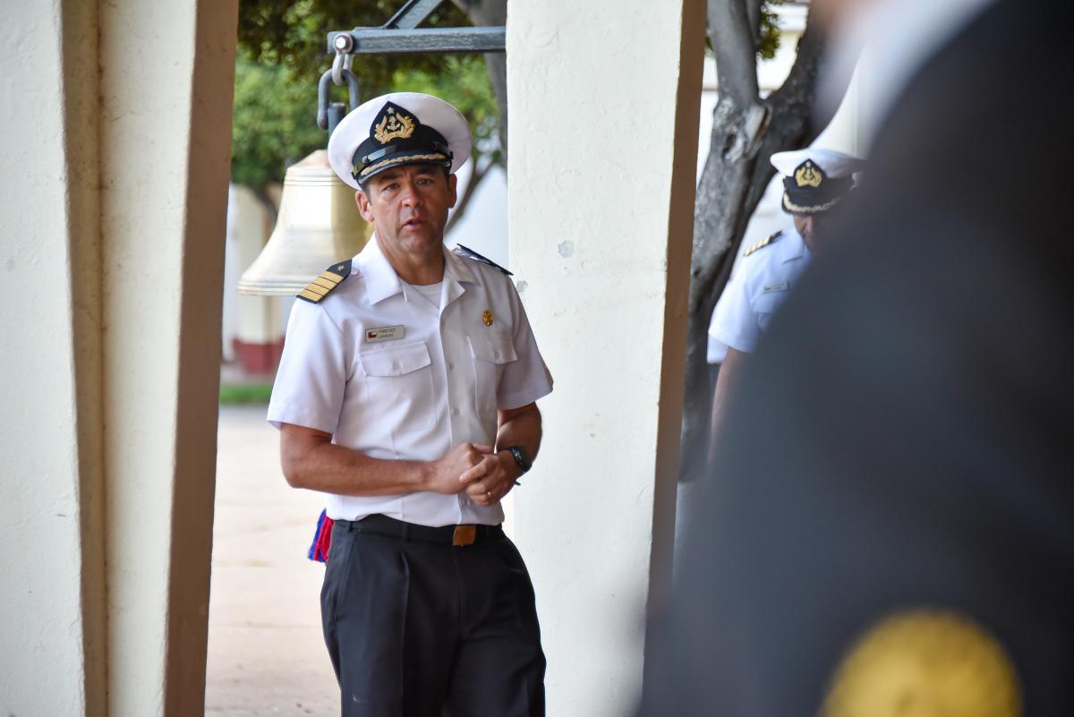 La bienvenida estuvo a cargo del Director de la Academia, CN S.Laymuns, quien en el Patio Hyatt explicó los objetivos y características del Diplomado de Mando y Liderazgo, programa que contempla actividades académicas en dependencias de la Academia de Guerra Naval de Chile.